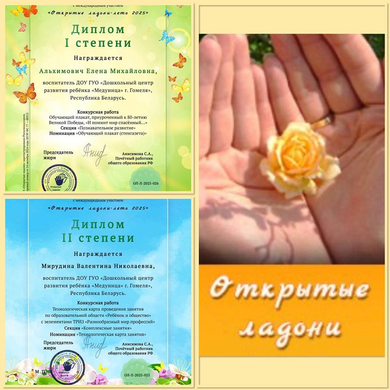 Наши воспитатели ГУО "Дошкольный центр развития ребенка "Медуница" г.Гомеля" Центральной районной г Гомеля организации Белорусского профсоюза работников образования и науки стали дипломантами на Всероссийском конкурсе с международным участием презентаций и методических разработок для учителей и школьников, воспитателей и дошкольников «Открытые ладони 2025»!